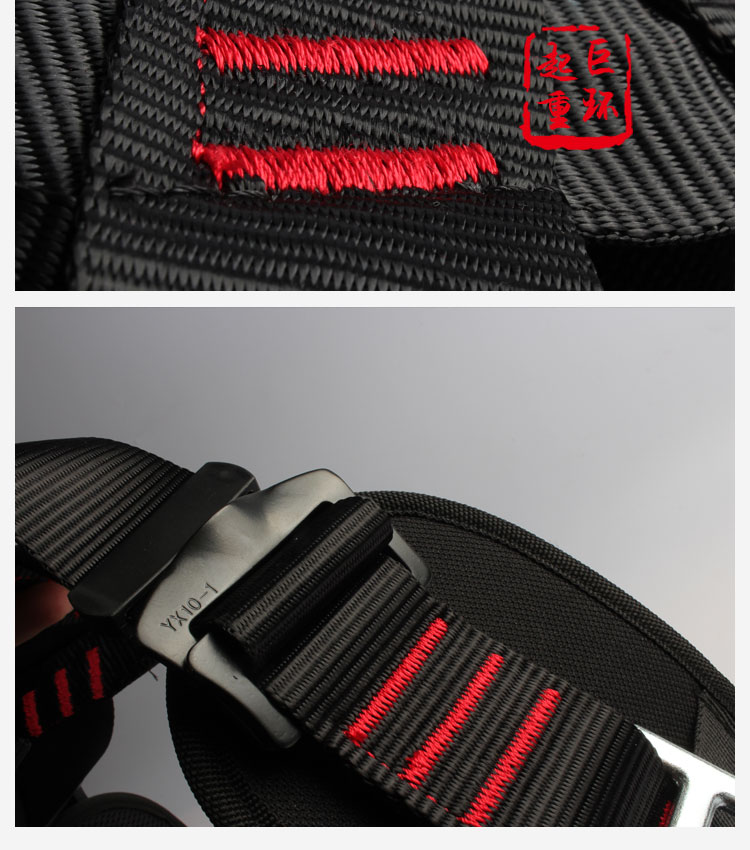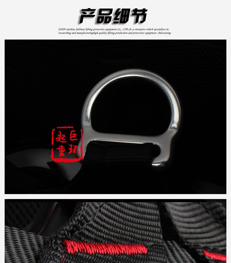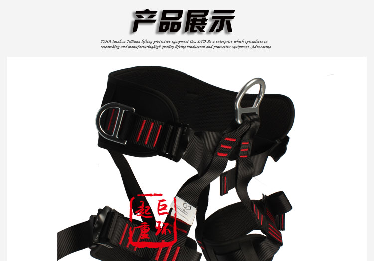 • 产品描述:详细信息: )带宽45MM,涤纶材料,颜色:黑色,破断拉力≥22KN 2)腰部2个D环挂点,腹部一个D环挂点,全身4点可调节 3)安全五金配件热处理,表面镀锌/镀铬