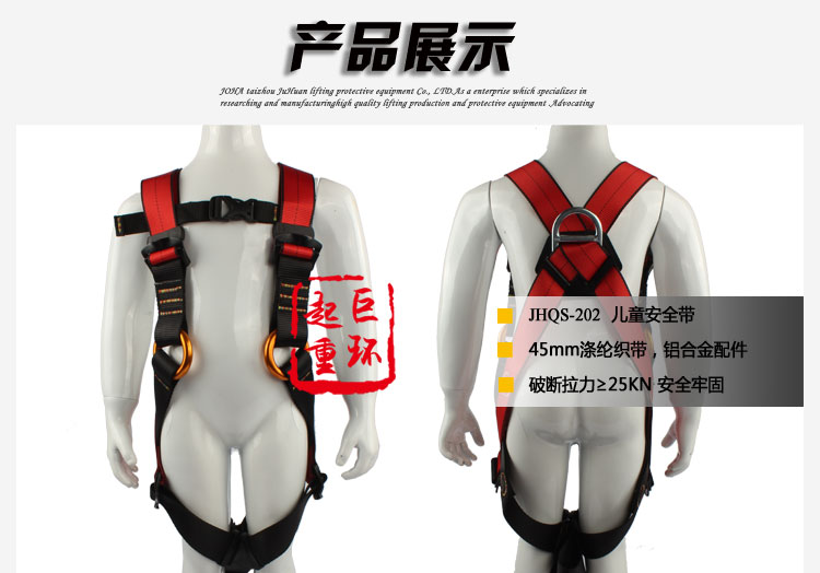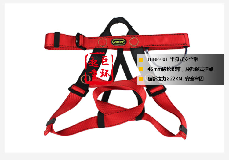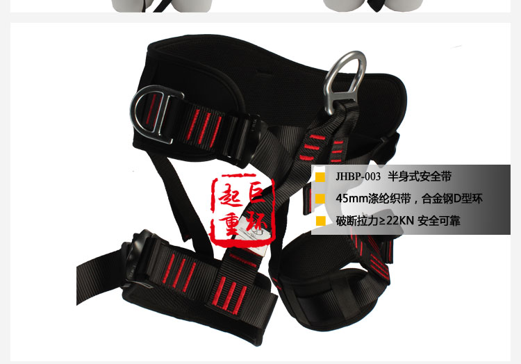 • 产品描述:详细信息: )带宽45MM,涤纶材料,颜色:红色/黑色,破断拉力≥25KN 2)后背1个D环挂点,全身5点可调节 3)安全五金配件热处理,表面镀锌/镀铬